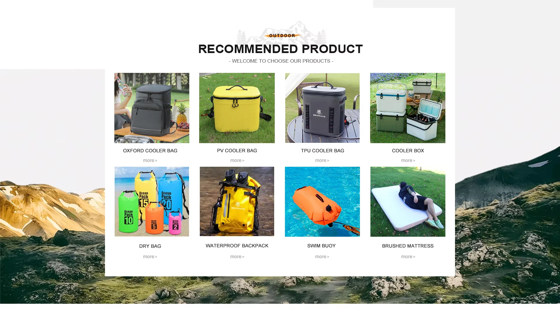 주요 제품:드라이 백, 쿨러 백, 쿨러 박스, 브러시 매트리스, 캠핑 및 하이킹 액세서리